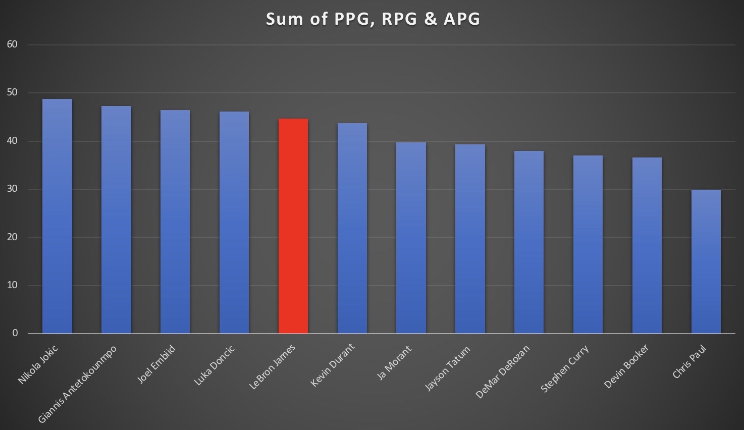 I think these graphs are enough now to properly show how absurdly good LeBron was in his 19th season. Players shouldn’t be this good this late in their careers. Opposition players learn to guard them better, they begin to slow down and injuries often play a significant factor. But LeBron James is still performing at this level. Now admittedly the Lakers did miss the playoffs this season, but when their star player is performing at this level, then it’s pretty clear that it isn’t his fault that the team isn’t winning enough games. LeBron has proven in the past that he can drag an average team to the finals: just look at the Cavaliers team that he dragged to the 2007 finals. There were a lot of issues in the 2021/22 Lakers, including chemistry issues and Anthony Davis and Russell Westbrook just not performing to the standard expected of them, but also the Western Conference was incredibly strong last season. It was an incredibly disappointing season for the Lakers, but not for LeBron. He was exceptional, and can only do so much when the other players simply aren’t performing.