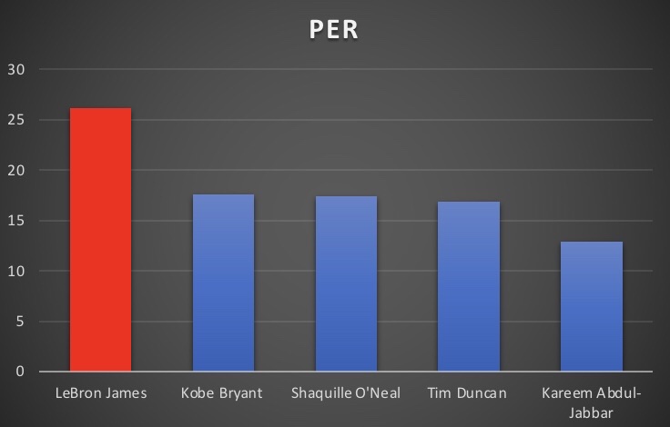 The most typical names that are put into a top 10 all time discussion of NBA players are: Michael Jordan, LeBron James, Kareem Abdul-Jabbar, Magic Johnson, Bill Russell, Wilt Chamberlain, Larry Bird, Tim Duncan, Kobe Bryant and Shaquille O’Neal. Of these players, 5 of them played at least 19 seasons in the NBA: LeBron James, Kareem Abdul-Jabbar, Tim Duncan, Kobe Bryant and Shaquille O’Neal. Therefore, to look at how ridiculous LeBron’s 19 season was, it makes sense to compare his 19th season to these other all time greats.