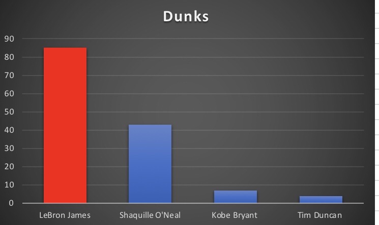 A huge part of LeBron’s game is his athleticism. He is, in my mind, without a doubt the greatest athlete to ever play the game. One of the best ways to look at a players athleticism is to look at the number of times they dunked the ball throughout the season. LeBron has always been known for ability to do this, and he was still remarkably good at doing it last season.
