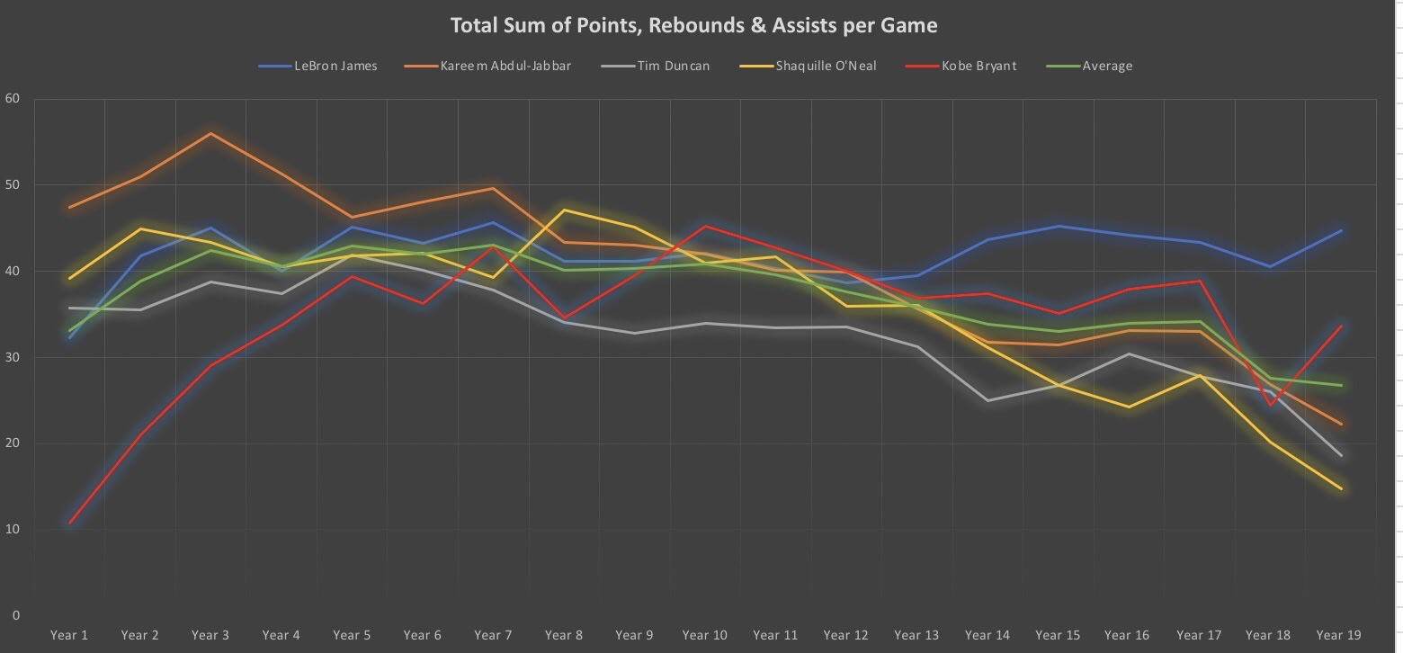 A good way of looking at overall production of a player throughout a season is to add together their points per game, rebounds per game and assists per game to give you a total. A season where a player has a total of 40 or over is an excellent season. Below is a chart tracking the totals for all of the players previously mentioned through 19 seasons.